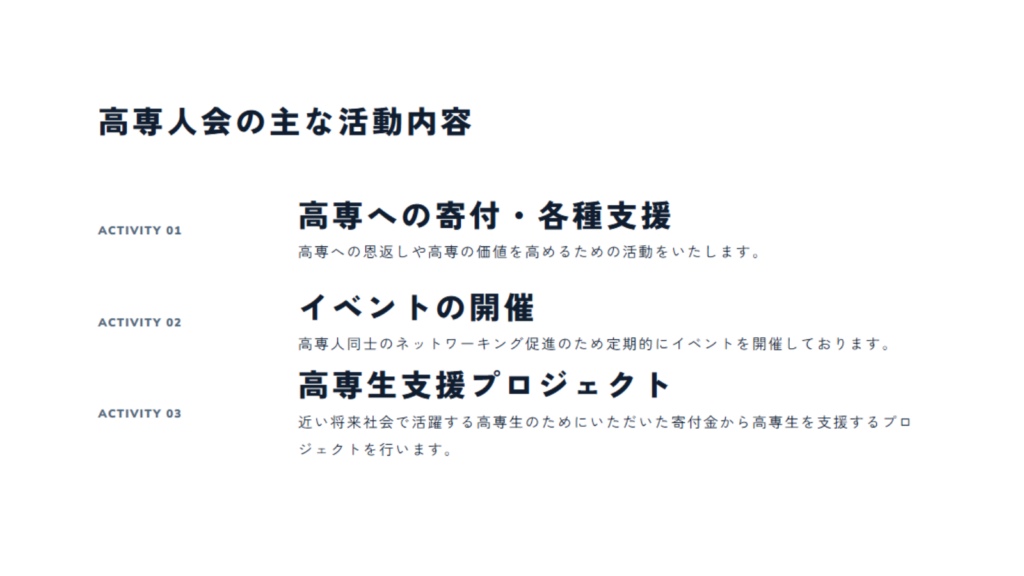 一般財団法人高専人会は、全国に点在する高等専門学校(高専)の卒業生、現役生、教職員など、高専に関わる全ての人を結ぶ同窓会組織です。高専卒業生の有志によって2022年5月に創設されました。
