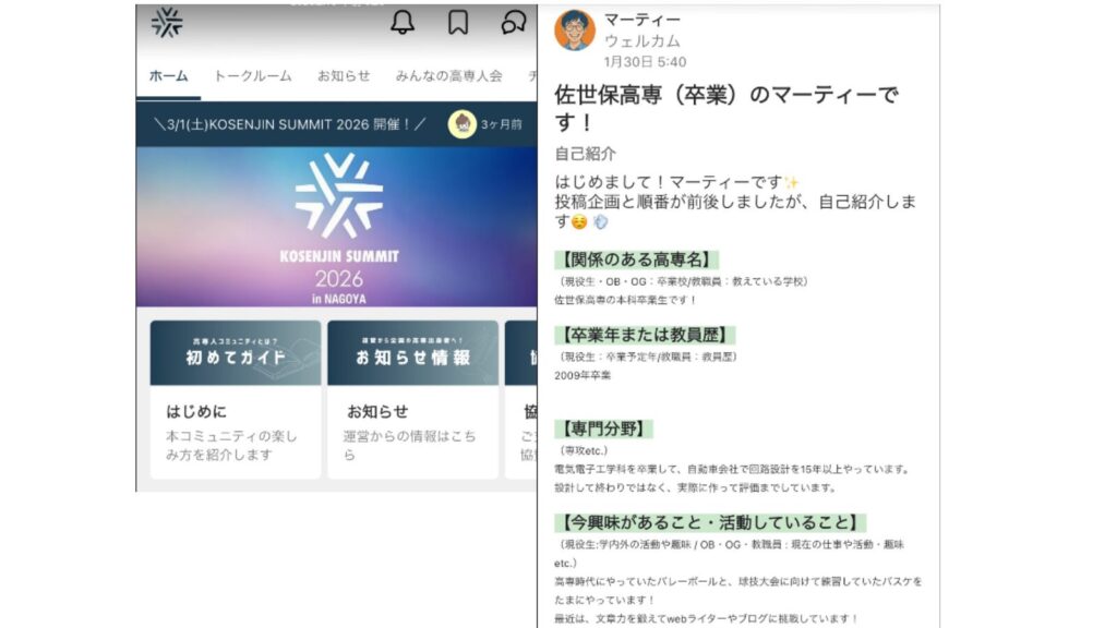 高専人会のコミュニティは無料で参加できるため、未登録の方はぜひ登録して中を覗いてみてください。全国の仲間たちと交流を深め、高専全体を一緒に盛り上げましょう!